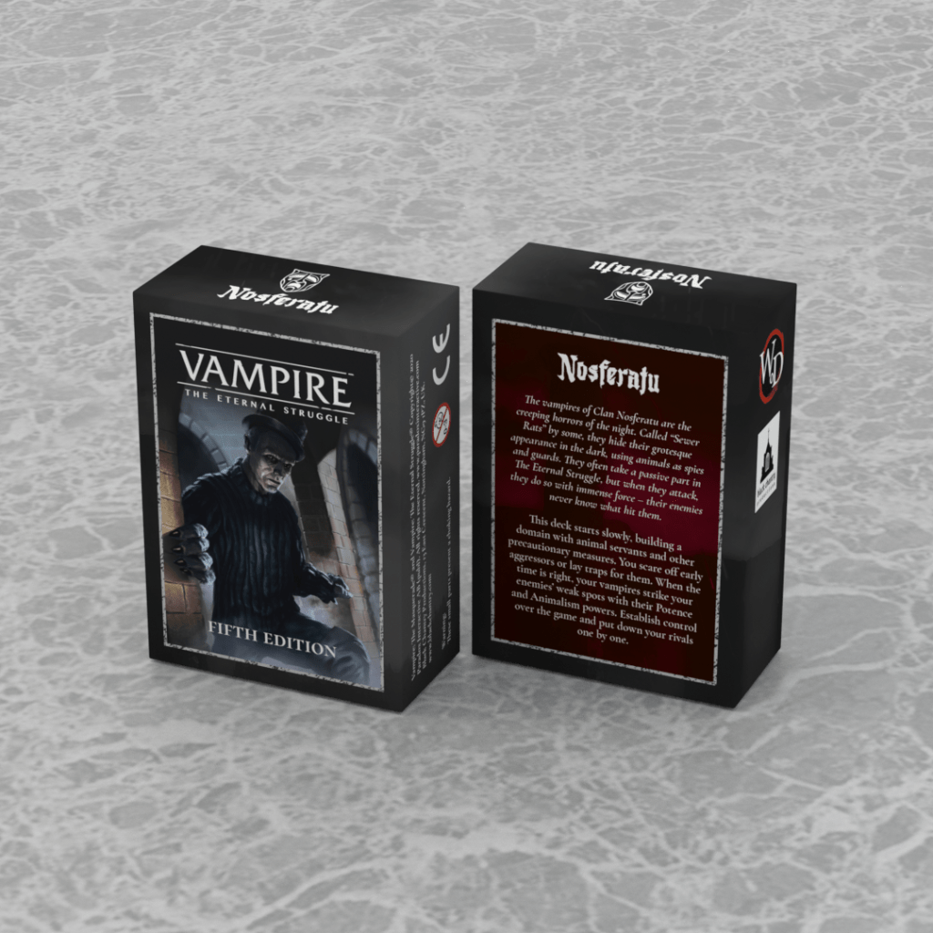 The vampires of Clan Nosferatu are the creeping horrors of the night. Called “Sewer Rats” by some, they hide their grotesque appearance in the dark, using animals as spies and guards. They often take a passive part in The Eternal Struggle, but when they attack, they do so with immense force – their enemies never know what hit them.