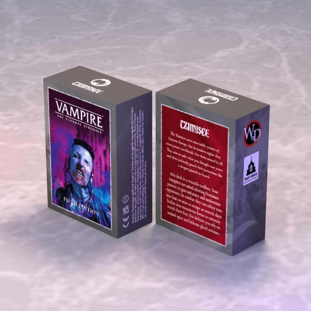 This is a deck with 77 library cards and 12 crypt cards, ready for play out of the box or customizable with other Vampire: The Eternal Struggle cards. Each player needs a deck to play.